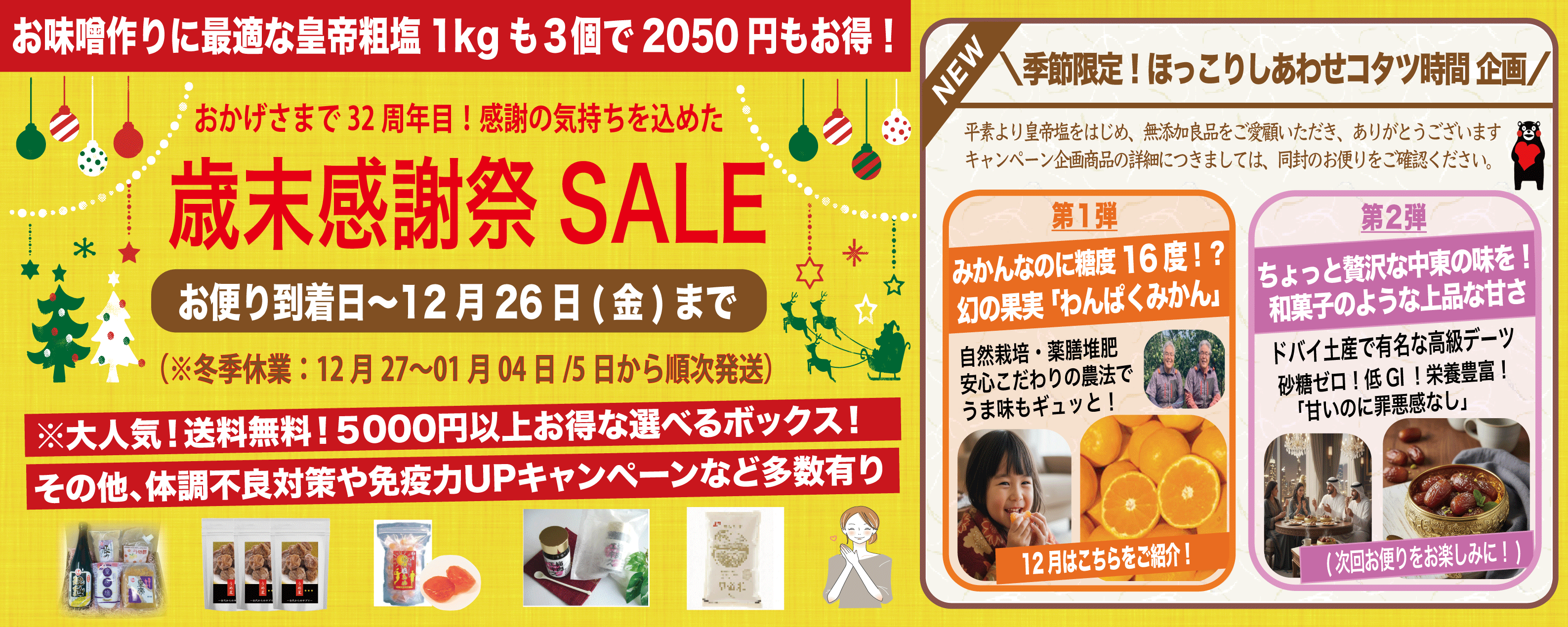 - 長らく”皇帝塩および無添加良品”をご愛顧頂きまして、誠にありがとうございます。これまで以上に皆さまが安心して、おいしい食事ができるように。そして、健康寿命を延ばすお手伝いができるよう努めてまいりますので、今後ともよろしくお願い致します。
