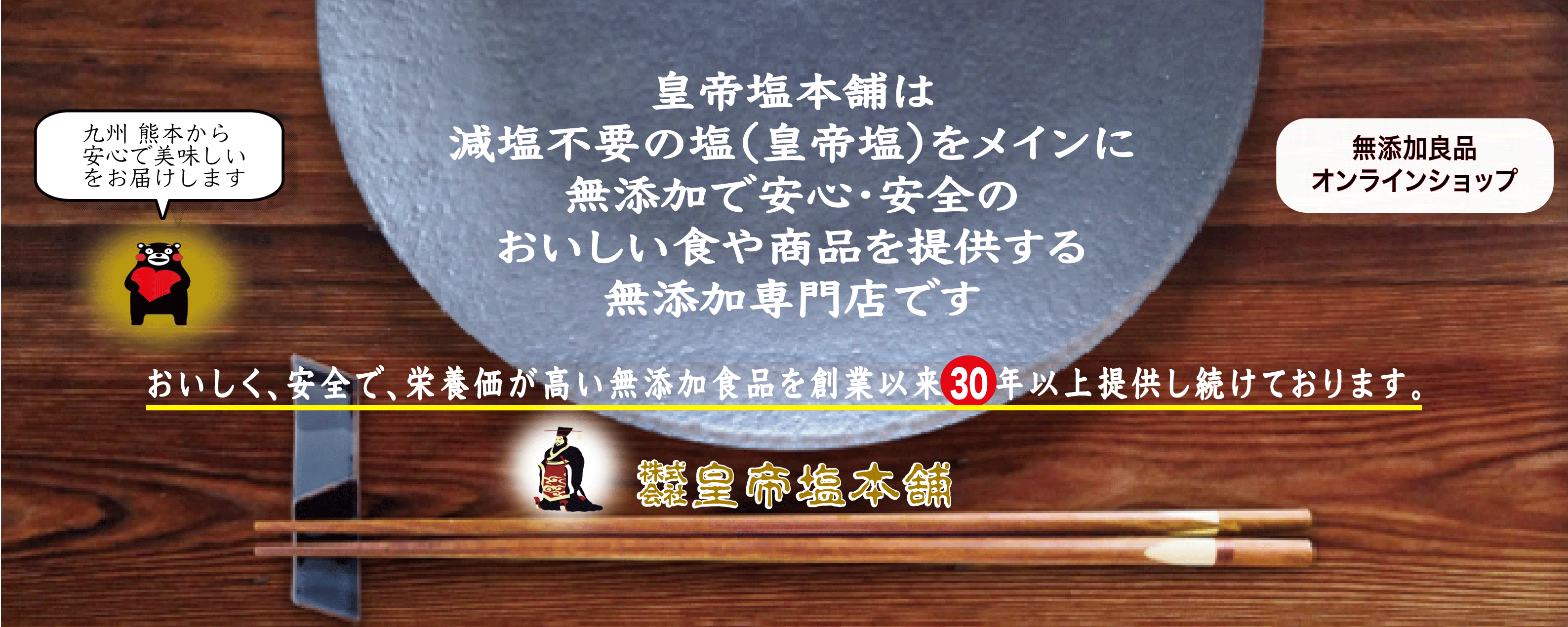 - 長らく”皇帝塩および無添加良品”をご愛顧頂きまして、誠にありがとうございます。これまで以上に皆さまが安心して、おいしい食事ができるように。そして、健康寿命を延ばすお手伝いができるよう努めてまいりますので、今後ともよろしくお願い致します。