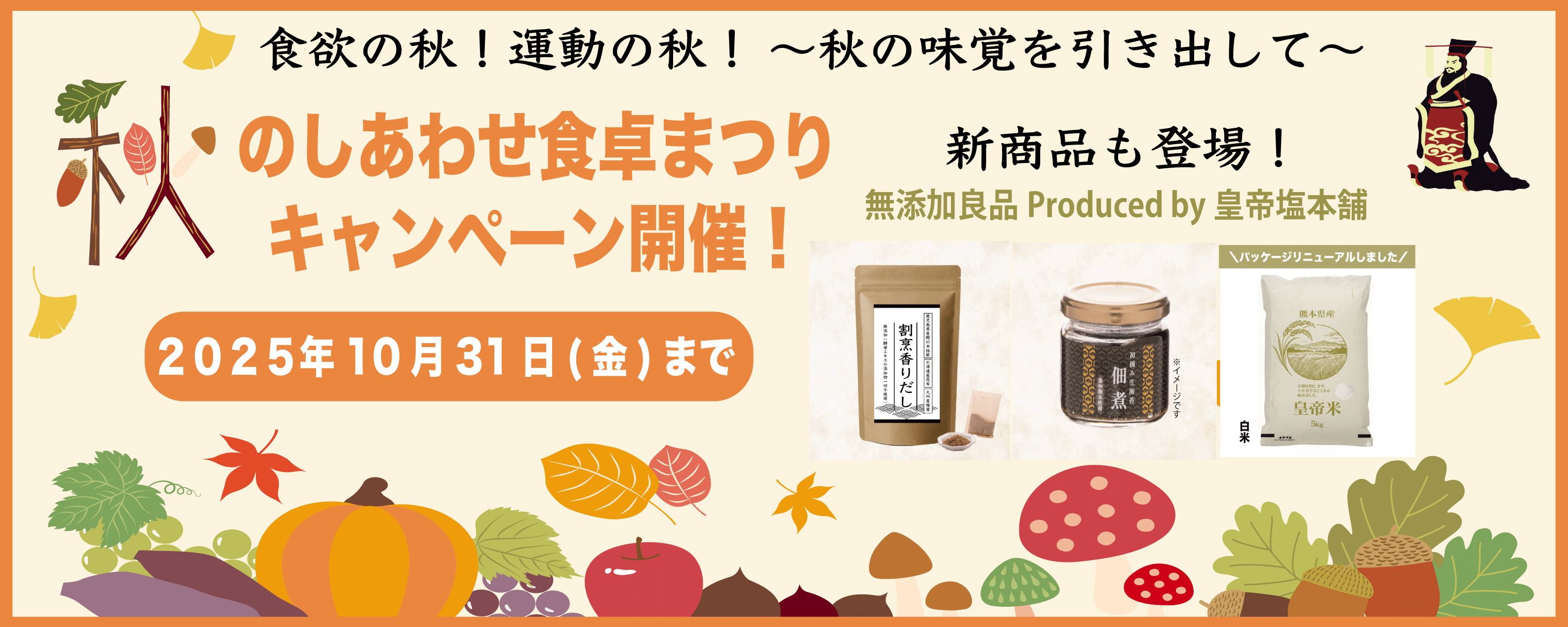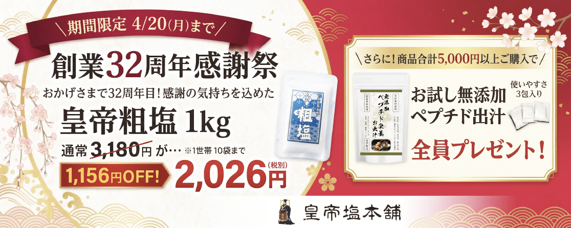 - 長らく”皇帝塩および無添加良品”をご愛顧頂きまして、誠にありがとうございます。これまで以上に皆さまが安心して、おいしい食事ができるように。そして、健康寿命を延ばすお手伝いができるよう努めてまいりますので、今後ともよろしくお願い致します。