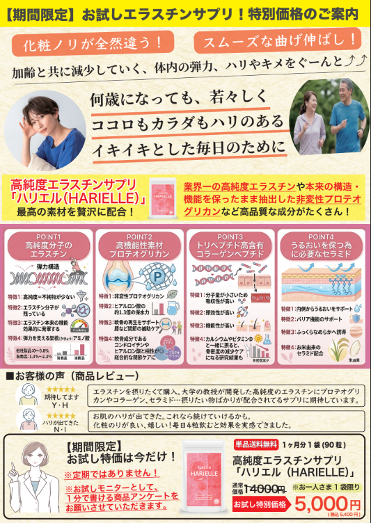 【お試しモニター】高純度エラスチンサプリ 「ハリエル(HARIELLE)」